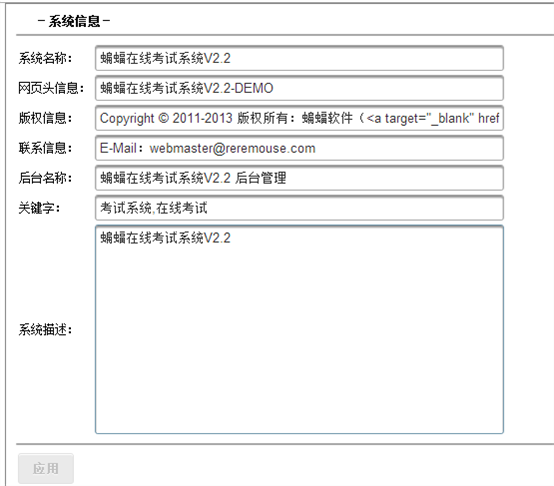 系统名称、关键字、描述、联系方式等配置在网站后台中。购买授权码后,“应用”按钮将被激活,一键可修改系统信息。如下图所示: