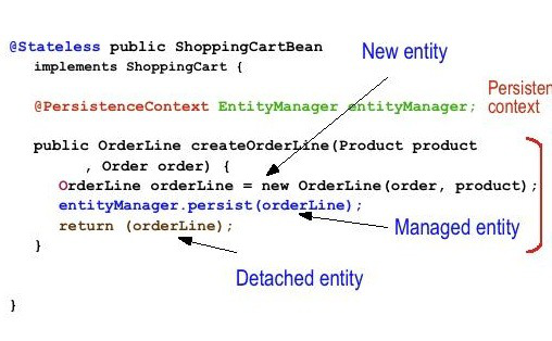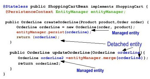 下面的代码说明了一个实体的生命周期。容器托管的EntityManager参考使用注入持久化上下文的诠释。一个是创建新秩序的实体和实体具有新的境界。坚持叫,使之成为一个管理的实体。因为它是一个无状态会话bean它是由容器管理的事务默认使用,当事务提交时,该命令是由数据库中的持久性。当订单行返回的实体在实体年底的交易是一个脱节。