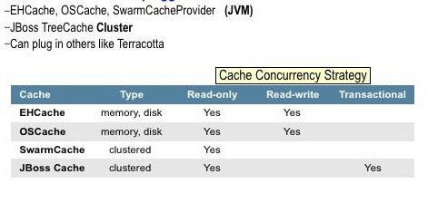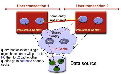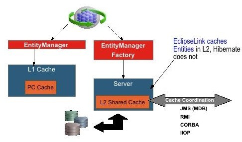 Hibernate的JPA的持久性提供不同的缓存架构的EclipseLink比:它不是默认配置,它不缓存enities只是ID和状态,你可以插入不同的L2缓存。下面的图表显示了不同的二级缓存类型,您可以插入休眠。