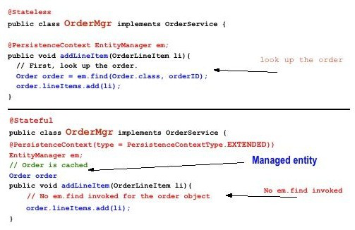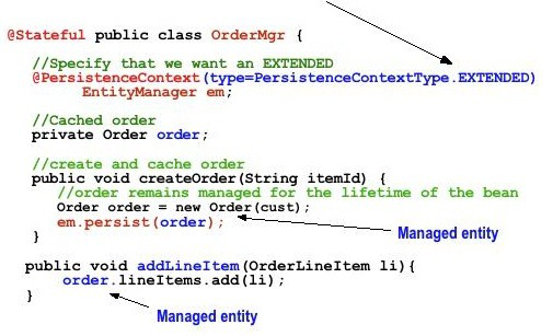 下面的代码显示了会议的范围内的EJB的持久性与扩展的命令行项目为例,一个在用状态情况下补充。该命令后的方法是坚持在createOrder,但它仍然管理,直到EJB删除方法被调用。在addLineItem方法,令实体可以被更新,因为它是管理,更新将坚持在该交易结束。