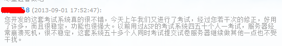 随着本站自主产品“蝙蝠在线考试系统”的广泛使用,系统拥有的卓越性能越来越被用户认可与体会,以下是对部分用户的评价摘录: